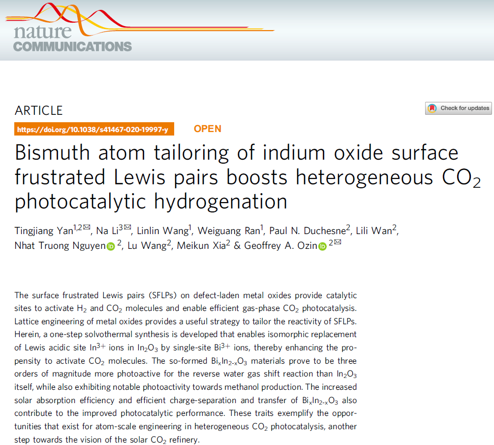 颜廷江教授在国际顶级期刊《自然-通讯》(Nature Communications)上发表了题为“Bismuth atom tailoring of indium oxide surface frustrated Lewis pairs boosts heterogeneous CO2 photocatalytic hydrogenation”的学术论文。斗地主