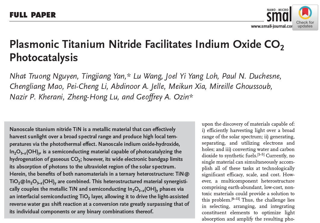 2020年11月,颜廷江教授与Ozin教授继续合作,将SFLPs型In2O3-x(OH)y与具有金属特性的TiN材料耦合,经过煅烧处理后,所得复合催化材料TiN@TiO2@In2O3−x(OH)y可以在较宽的光谱范围内收集阳光,并透过光热效应产生高的局部温度,使其能够以极大超过单个组分或任何二元组分的转化率驱动光激活水气变换反应。相关研究成果以“Plasmonic Titanium Nitride Facilitates Indium Oxide CO2 Photocatalysis”为题发表在国际著名刊物Small(影响因子11.459)。斗地主
