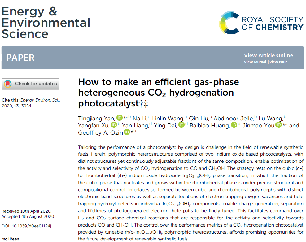 此外,2020年8月,颜廷江教授还基于立方相(cubic,c-)到菱形相(rhombohedral,rh-)氧化铟In2O3-x(OH)y的相变,通过调节rh/c-In2O3-x(OH)y多晶型异质结对CO2加氢光催化剂性能的指标,构建出了新型高效的缺陷异相结光催化剂,对未来可再生合成燃料的发展提供了良好的契机。相关工作发表以“How to Make an Efficient Gas-Phase Heterogeneous CO2 Hydrogenation Photocatalyst”为题发表在国际顶级期刊Energy & Environmental Science(影响因子30.289)。斗地主