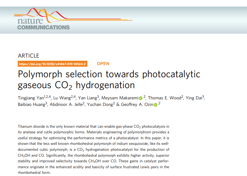 第一篇论文为“Polymorph selection towards photocatalytic gaseous CO2 hydrogenation”(DOI:10.1038/s41467-019-10524-2)发表在《自然》子刊《Nature Communications》上,颜廷江教授为该论文的第一作者与通讯作者,斗地主