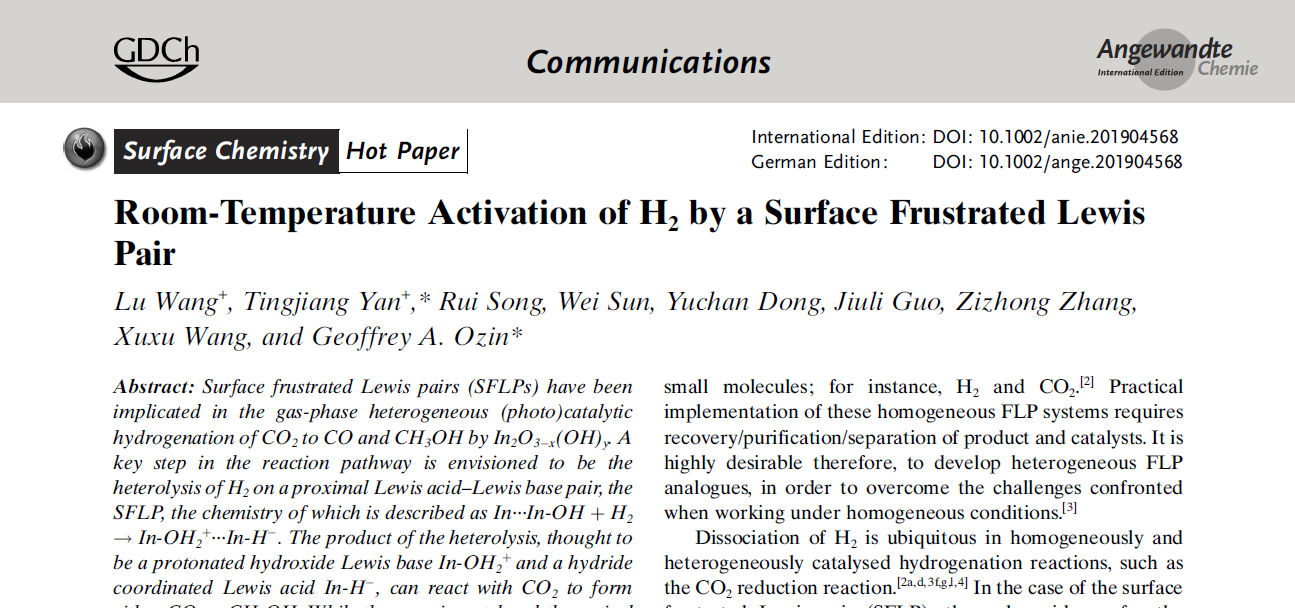 为第一署名单位;第二篇论文为“Room-Temperature Activation of H2by a Surface Frustrated Lewis Pair”(DOI:10.1002/anie.201904568)发表在化学领域顶级期刊《Angewandte Chemie International Edition》,并被编辑选为“Hot Paper”,颜廷江教授为共同第一作者与通讯作者,斗地主
