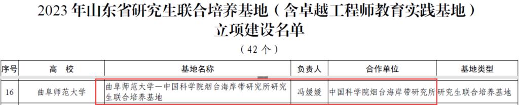 —中国科学院烟台海岸带研究所研究生联合培养基地”成功获批。 这是继获批学院与汶上圣泽中学、汶上县教师教育中心研究生联合培养基地后,新增的又一山东省研究生联合培养基地,标志着学院研究生联合培养基地建设取得新成效。