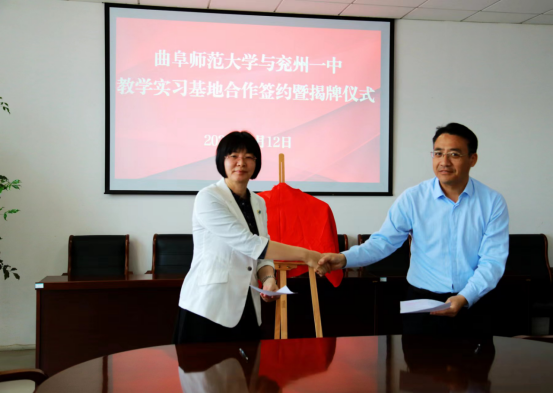 冯媛媛院长与兖州一中副校长徐建分别代表两校共同签订教学实践基地合作协议,赵琪书记与牛广犇总督学一起为教学实践基地挂牌。挂牌仪式后,学院领导与实习学生进行了座谈。