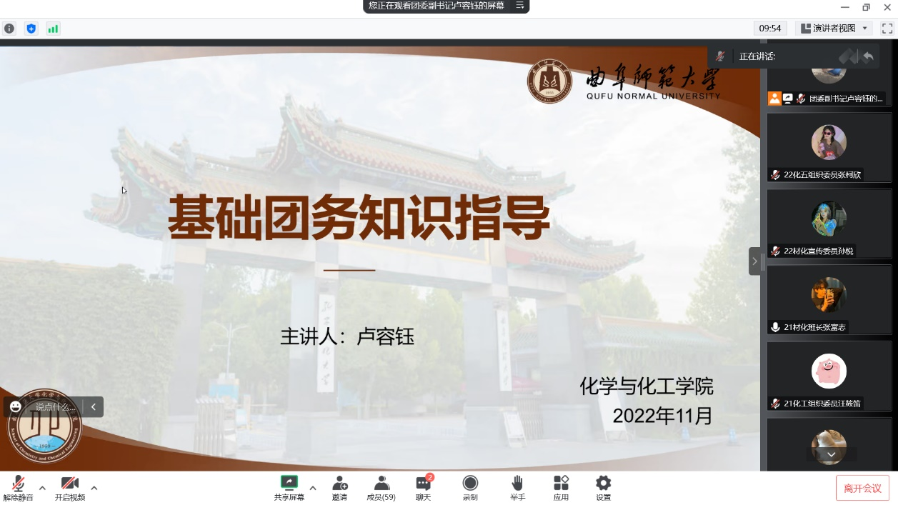 本次培训中,团委副书记卢容钰以“团务知识指导”为主题,围绕日常团务工作、团员发展和团支部建设展开本次培训。会议上,卢容钰向2021级和2022级的团干部强调了青年大学习,介绍了智慧团建“三会两制一课”上传,并从多个角度对团员建设与团支部建设做了相关阐述,解答了与团务相关的问题。