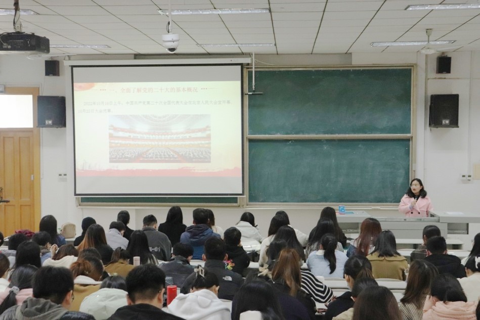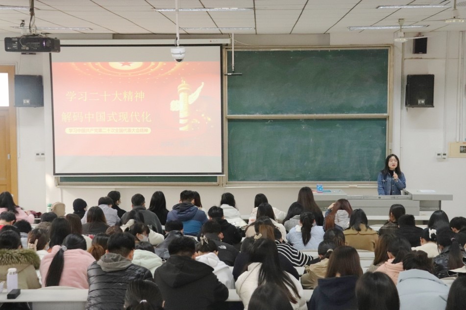 会议伊始,宣讲团成员、马克思主义学院硕士研究生隋启贤以“党的二十大——坚持和发展中国特色社会主义政治宣言和行动纲领”为主题,以二十大的召开背景为出发点,从二十大的基本概况、重大意义、主旨思想以及党的二十大精神的主要内容四个方面,对党的二十大精神进行深入的解读,强调了习贯彻党的二十大精神的重要性及必要性。二十大擘画了新时代中国特色社会主义的宏伟蓝图即以中国式现代化全面推进中华民族伟大复兴,宣讲团成员吕昕以“学习二十大精神,解码中国式现代化”为主题,以中国式现代化为切入点,细致分析中国式现代化的历史进程、理论内涵以及实践要求,进一步加深了同学们对党的二十大精神内涵的理解。