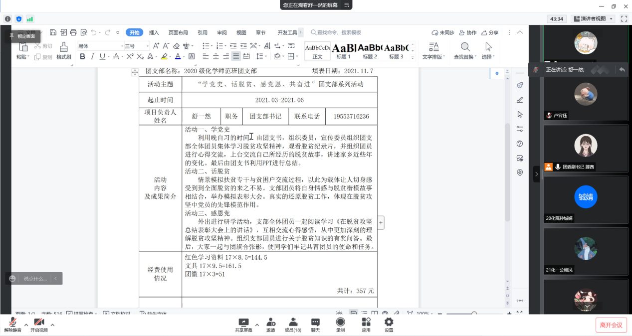 图为舒一然共享已主持立项的活动申请表