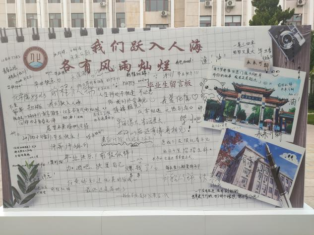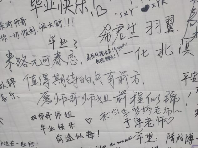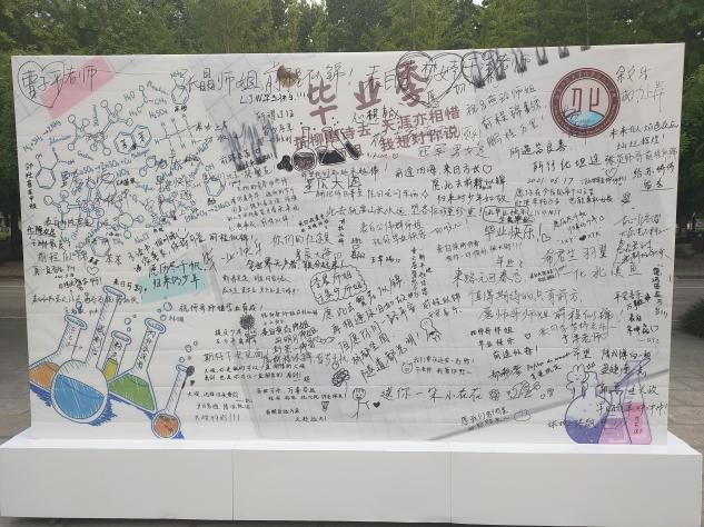 于院楼前小广场设置两个展板,分别为“折柳赠诗去,天涯亦相惜——师哥师姐,我想对你说”板面和“我们跃入人海,各有风雨灿烂——毕业生留言板”板面。2018级,2019级和2020级化院同学为2017级师哥师姐在“折柳赠诗去,天涯亦相惜——师哥师姐,我想对你说”板上写下一份真挚的祝福以及对未来的期待。2017级同学根据四年的大学生活,在“我们跃入人海,各有风雨灿烂——毕业生留言板”板面上为师弟师妹们写下祝愿和期望,也可表达对老师、对斗地主