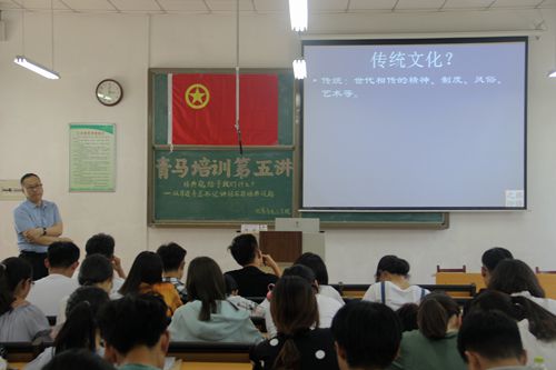 韩锋老师首先从《将传统文化当做独特战略资源》这篇文章谈起,层层递进,历引经典,详细解释何为“传统”、“文化”。以“文”、“明”等字为例,讲解其不同文化时期的字样,利用释义让同学们更好地领略经典文化的文学性与可读性。随后,韩锋老师列举多处习近平总书记在报告或讲话中引用的经典文化名言,结合儒家思想,通过从富强走向文明的中国需要经典、礼乐传统与国民教养需要经典两个方面阐明经典文化中文学价值的重要性。最后,他清晰明确地指出,经典具有丰富知识、扩大视野、陶冶性情、提升涵养,开发智慧、启迪心灵、优化人格、承续文脉等多重意义。韩锋老师与斗地主