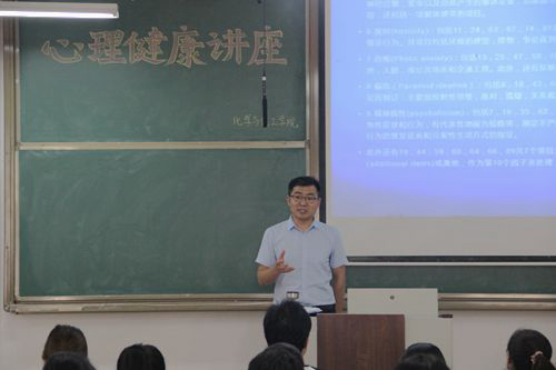 讲座开始前,活动负责人发放症状自评量表抑郁量表等测试表。紧接着,马振华介绍工作经历,并简要阐述有关心理问题。他要求在座同学十分钟内完成症状自评量表,并在同学们回答完毕之后对测试内容进行详细的说明和解读。其中,测试内容包括九种因子,即躯体化、强迫症状、人际关系敏感、抑郁、焦虑、敌对、恐怖、偏执及精神病性。各因子都可以反映出被测试者在某方面的症状情况,通过计算因子的得分进而了解相关的症状情况。之后,马振华向同学们简要介绍大学生心理健康的七个标准,即可以正确认识自我、乐于交往等七个标准。最后,马振华希望学生干部可以了解心理健康、掌握心理学常识,为学生工作的进一步开展做好准备工作。