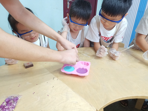 此次课程个孩子们带来极大的兴趣,课堂气氛活跃,小朋友回答积极主动,也给成员们维持课堂纪录带来了挑战。赵琪老师和孙金玲老师融入了小朋友的课堂,同时也被小朋友的奇思妙想和欢声笑语感染了。实验过程中,在所有团队成员的协助下,一步步操作得以完成,最终,小朋友制得自己喜爱的香皂。