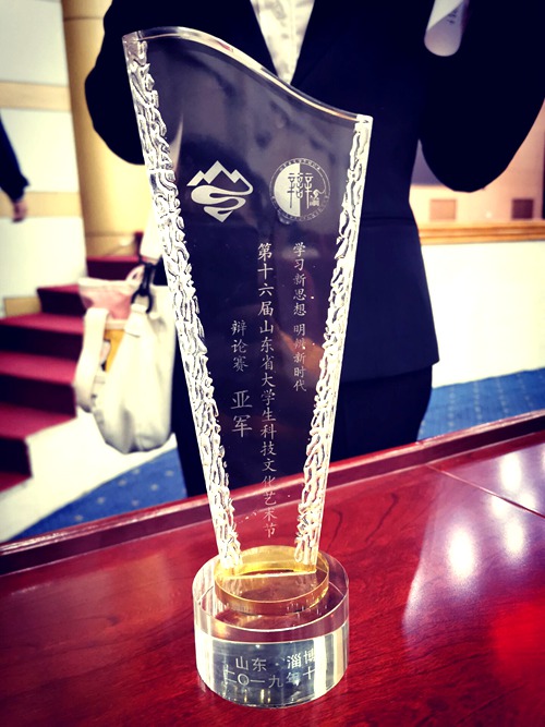 学子贺丹阳作为辩手随校辩论队代表学校参加此次比赛,队员们凭借着充分的准备与自身的实力获得了全省亚军的好成绩。