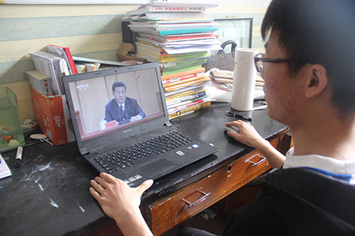 学子通过电脑、手机等不同方式,认真学习领悟五四精神,专心听取习近平总书记对新时代中国青年的殷切希望。