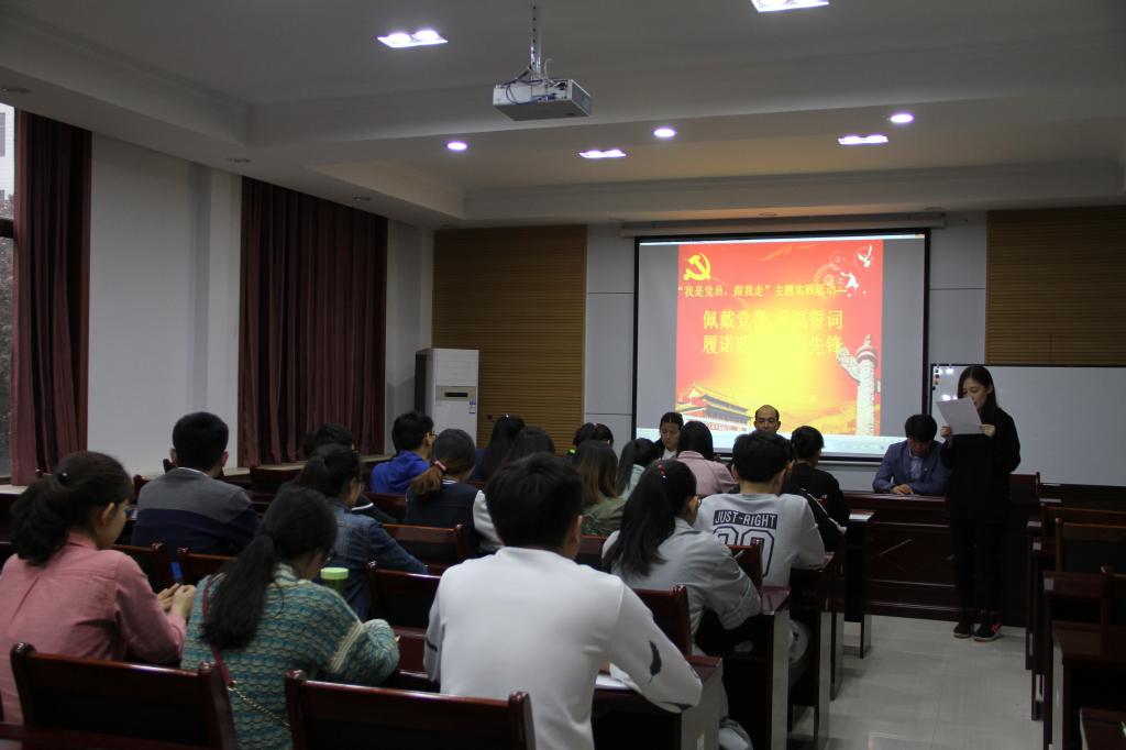 各党支部召开全体党员大会前,分别召开支委会,学习讨论本支部活动方案,确定支部大会议程。全体党员大会由各党支部书记主持,大会主要有四项议程:学习解读学校及学院党委关于“我是党员,跟我走”主题实践活动的工作要求、佩戴党徽仪式、重温入党誓词、公开承诺。大会教育引导全体党员要“亮身份、践承诺,多奉献、争先锋”。要把思想建设放在首位,尊崇党章、遵守党规,以习近平总书记系列重要讲话精神武装头脑、指导实践、推动工作,着力解决党员队伍在思想、组织、作风、纪律等方面存在的突出问题。
