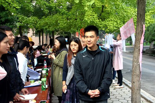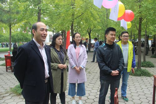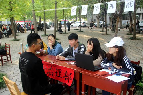 院楼前的小广场上极具吸引力的宣传标语展示着各部门自己的特色。新生们怀揣着对工作的期待信心百倍地来到各部门前介绍自己,各部门的成员也对其进行了积极地引导,热情地询问和认真的考核。
