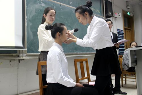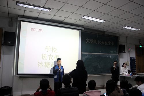首先,每班代表在台上以新颖的方式进行自我展示,展现了独特的团队风格和积极向上的参赛精神。接下来,竞赛进入高潮—问答环节,同学们踊跃回答问题,都在为最后的胜利而奋斗。在化妆和打领带环节中,帅气的模特因美丽的领带花样而更加耀眼,美丽的小仙女在化妆完毕后更是让人眼前一亮。最后为情景展示环节,在此环节中,每个班的幽默展示形象地展示了在现实生活中我们所遇到的文明礼仪问题。