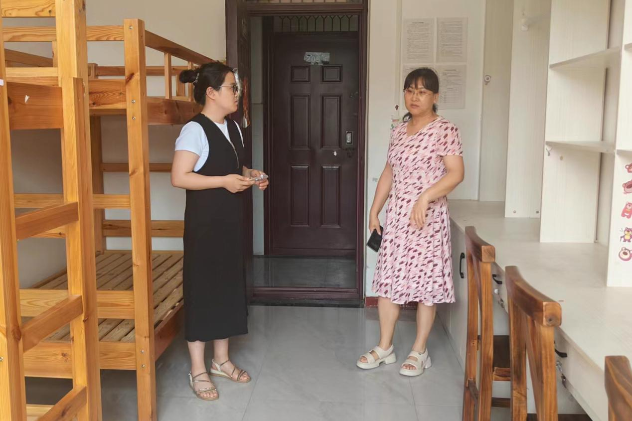 图为学院领导查看毕业生宿舍打扫状况