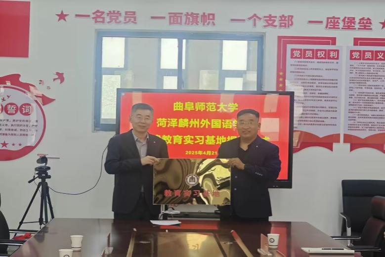 图为学院党委书记赵琪和菏泽麟州外国语学校校长刘明强共同为教育实习基地揭牌