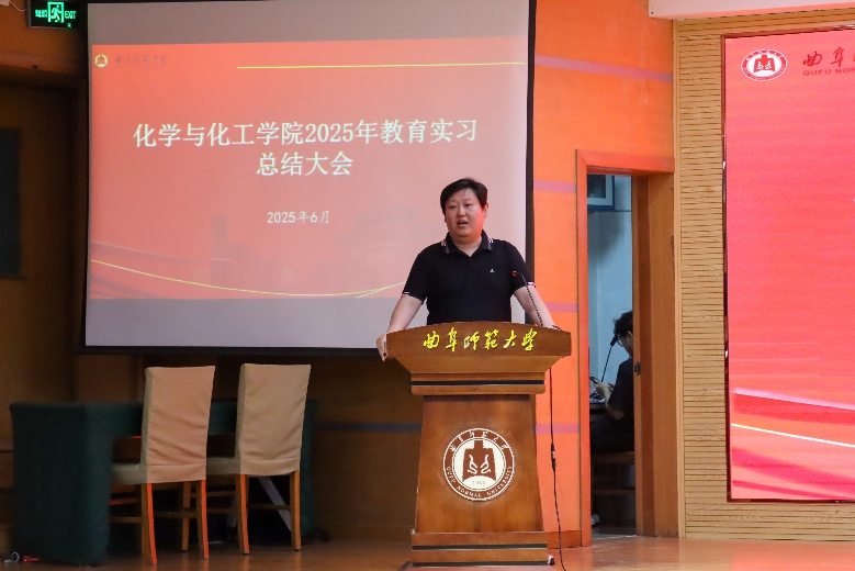 在孔子会堂召开2025年教育实习总结大会,会议由2022级辅导员冯德浩主持,2022级化学专业全体学生参加。