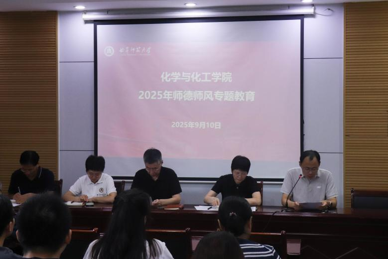 于9月10日在化学楼226会议室召开2025年师德师风专题教育,此次会议由学院党委书记赵琪主持,副院长刘鹏主讲,全体教职工参加。