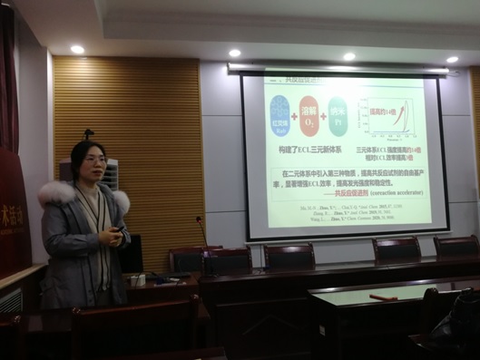 2020年12月21日下午,“先锋论坛”第九讲在化学楼226会议室如期举行,本次活动邀请到西南大学卓颖教授,并作了题为“高效电化学发光分析新体系的建立与分析应用”的学术报告,会议由斗地主