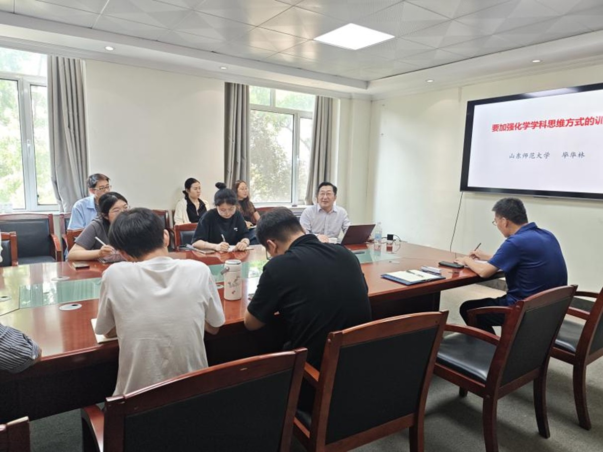 为进一步加强学术交流,特邀山东师范大学毕华林教授进行专题学术报告。5月24日,毕华林教授于化学楼218会议室作了“要重视化学学科思维方式的训练”报告。本次报告由学院李言信老师主持,化学教学论教研室教师及相关专业研究生参加。