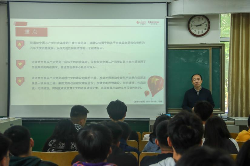 本次课堂以“发扬自我革命精神,推动全面从严治党向纵深发展”为主题。课堂伊始,王明科老师简要介绍了本节课的主题。随后,王明科老师以党的各大会议为序,详细介绍了党的发展历程,从党风、政风等多种角度指出不同时代党所面对的问题及应对措施。此外,王明科老师对新时代未来风气发展提出了独到的见解,提出了当代青年的责任担当,并对同学们给予期望。课堂最后,2022级辅导员冯德浩进行了课堂内容总结,对同学们表达期待。