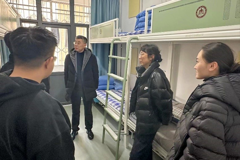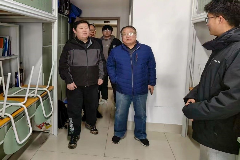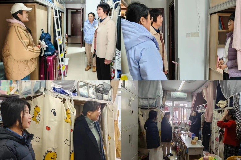 图为领导老师们走访宿舍照片
