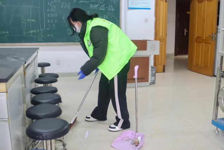 图为志愿者打扫实验室