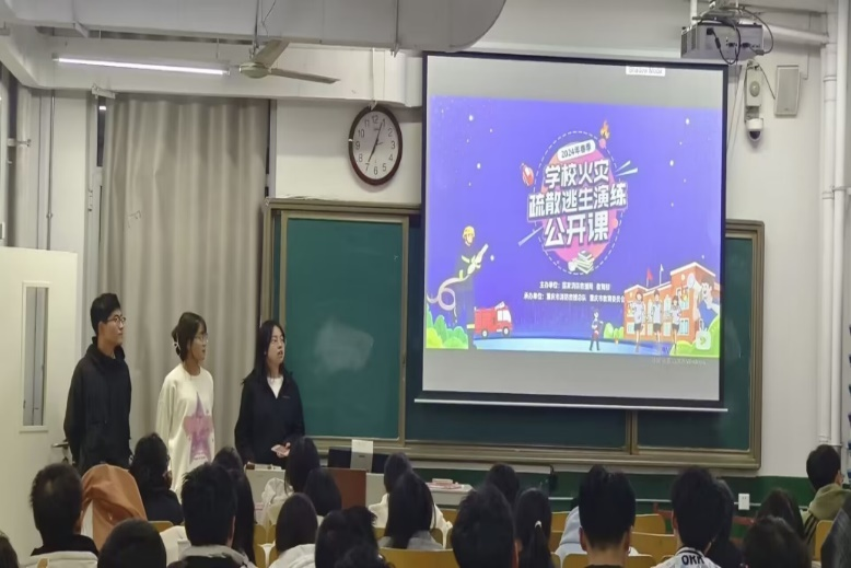 2023级本科生进行相关消防知识的宣传。公开课详细介绍了在不同场所发生火灾的有效疏通方法和正确的逃生姿势等消防知识,同学们掌握了简单且实用的逃生技巧,增强了对应急情况的处理能力。