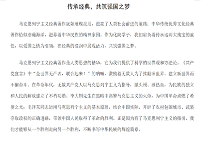 在本次征文活动中,同学们用文字表达了对马克思列宁主义精神的认同和中华优秀传统文化的热爱,深刻阐释了马克思列宁主义的理论价值和实践价值,并深入探讨了中华优秀传统文化的精髓所在。最终经过筛选,对“双经典”理解深刻、思想创新的同学入围校级比赛。