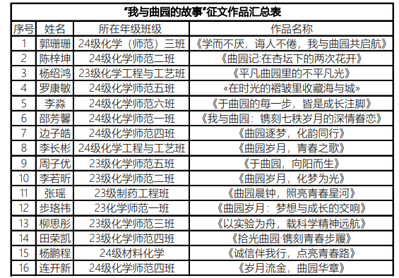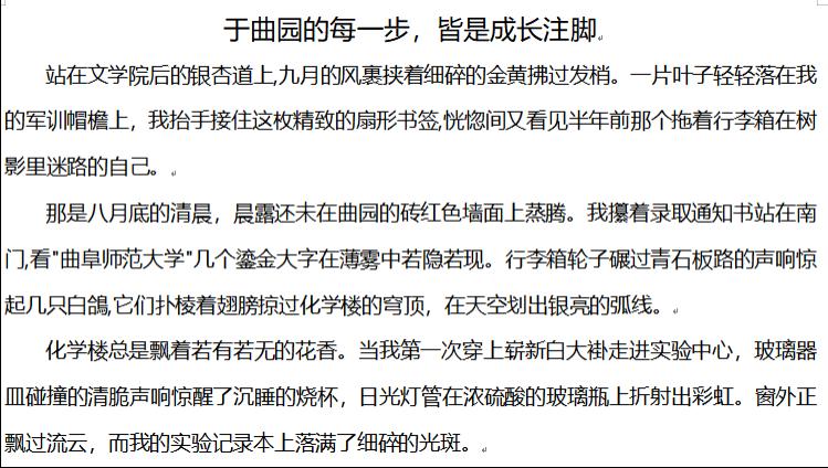 本次活动中,同学们以饱含深情的文字,围绕课堂学习、社会实践、师生情谊等方面,讲述了自己在曲园的成长故事、难忘瞬间和独特感受。每一篇作品都生动地展现了大学生活的青春印记,表达了同学们对曲园的热爱之情。最后经过筛选,推选以下优秀作品至校级比赛。
