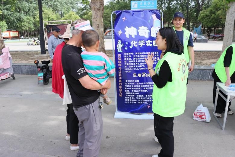 活动期间,志愿者向小朋友们演示了一系列趣味无穷的实验,如碘酒遇上维生素C瞬间变色的神奇反应,小苏打与醋酸携手“吹”大气球,以及高锰酸钾与双氧水碰撞释放氧气的奇妙景象等。此外,志愿者还结合自身所学向居民们科普了化学在环境保护方面的应用,将晦涩的化学知识转化为通俗易懂的讲解,让大家深刻认识到化学与环保息息相关。