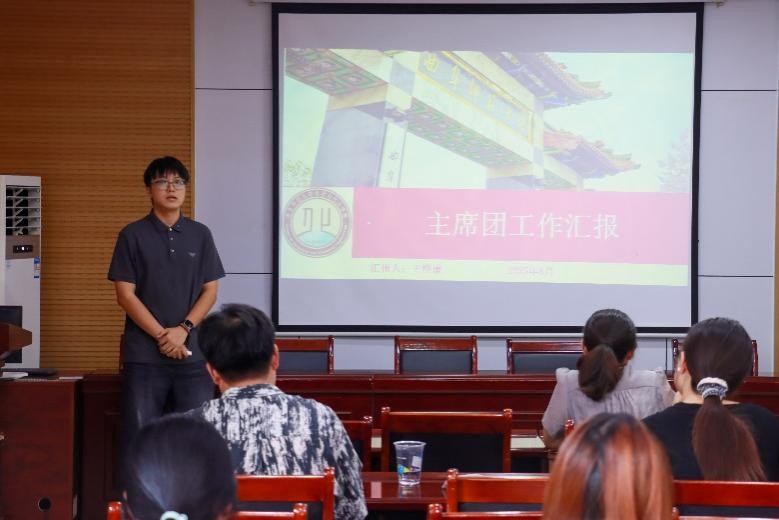 图为学生会主席王桦谦进行工作汇报