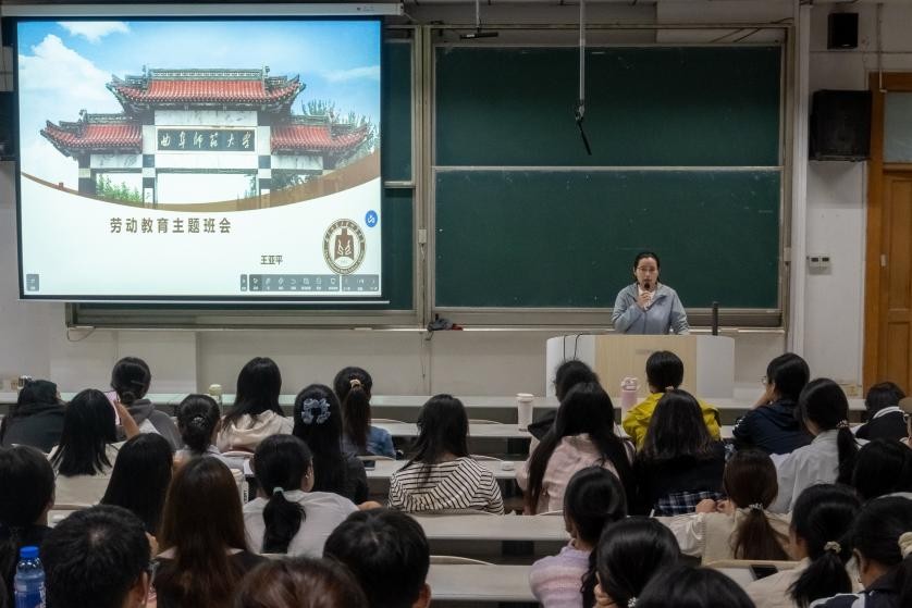 为深入贯彻落实高校劳动教育育人目标,引导学生树立正确劳动观,9月27日晚,2025级在综合楼106教室召开 “以劳树德,以劳增能” 主题班会,班会由辅导员王亚平主讲,全体同学参会。