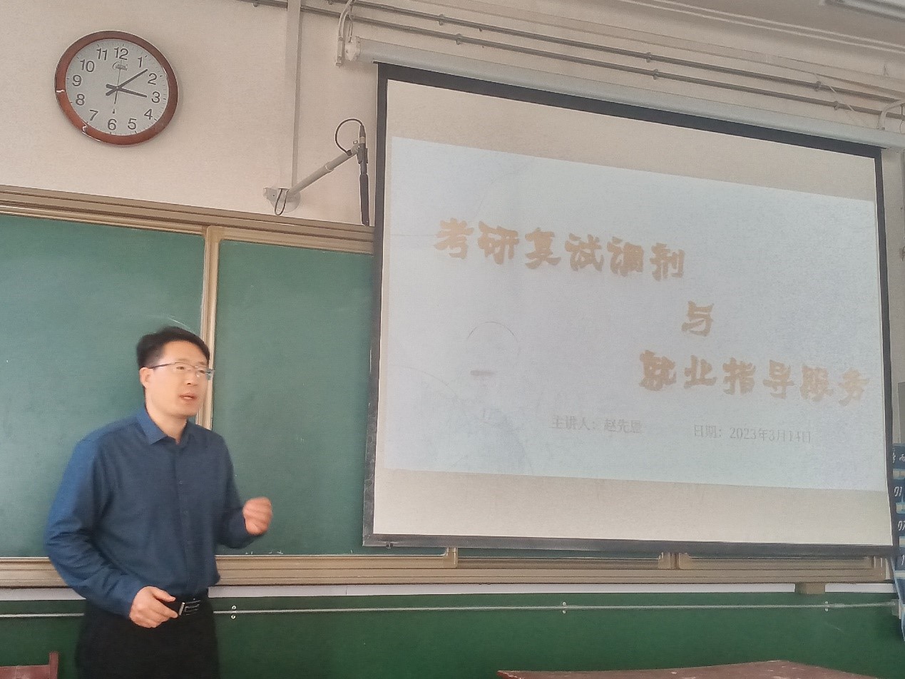 于2023年3月13号,在化院105教室开展考研复试调剂与就业指导交流会。此次交流会特邀2023届就业指导导师赵先恩老师主讲,主要面向2023届毕业生,并由化院学习部承办。