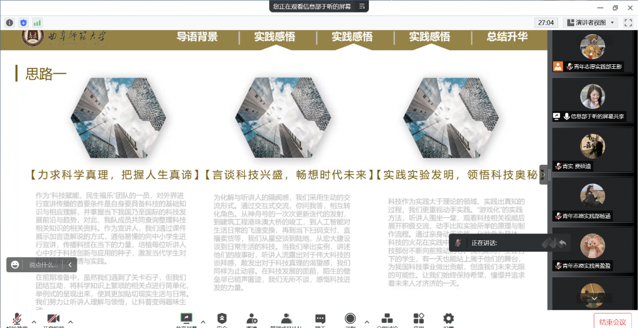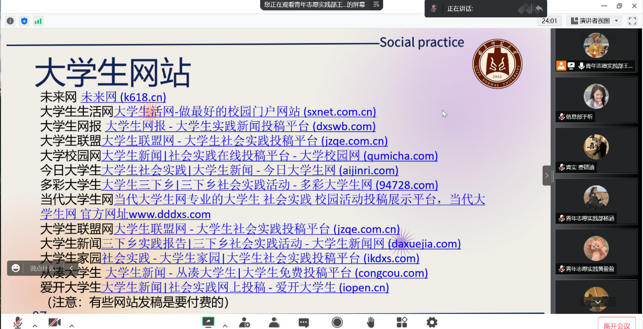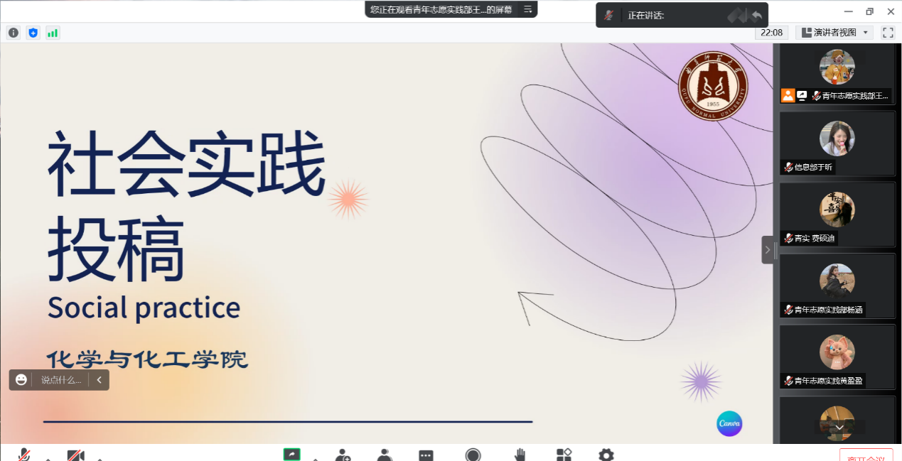 召开2022年暑期社会实践中期指导会议。各社会实践队队长及青年志愿实践部全体成员参会。本次会议由青年志愿实践部干事王影主持。
