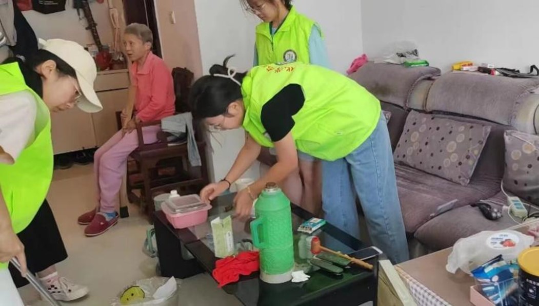 图为志愿者为老人打扫屋内卫生