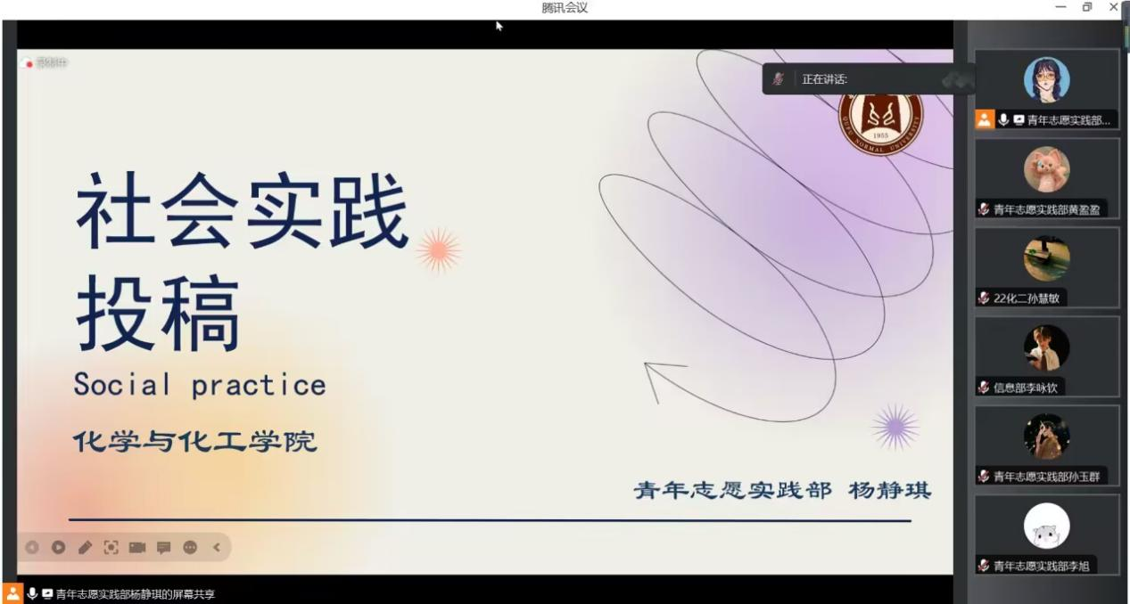 会议伊始,由青年志愿实践部干事杨静琪介绍本次会议的目的和主要任务。接下来,杨静琪展示了有关社会实践投稿的要求和注意事项。随后,信息部部长李咏钦详细讲解了中青网投稿的相关事宜。最后,青年志愿实践部刘佳琪介绍了实践报告的写法及其他注意事项。