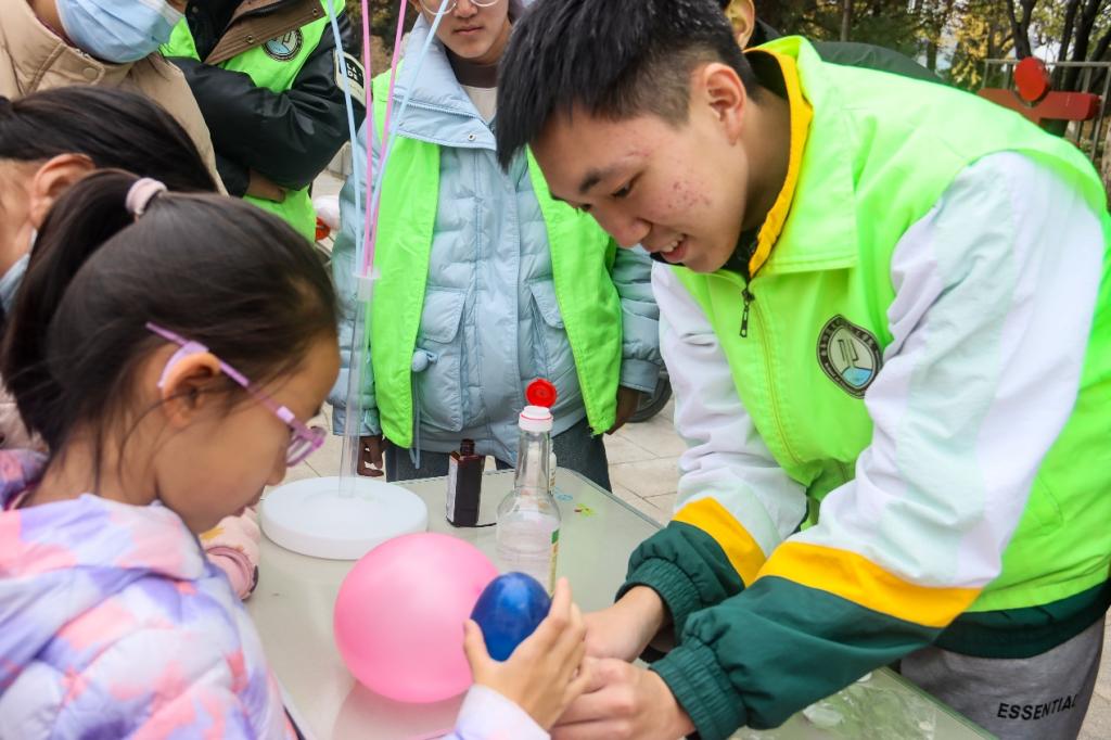 图为志愿者带小朋友做实验