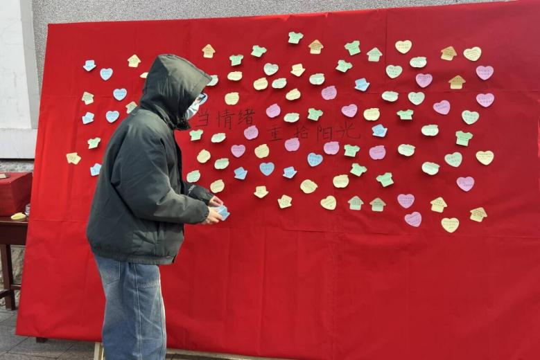 本次活动布置了“坏情绪垃圾桶”和“温暖分享站”两大模块,同学们将自己的“坏情绪”写在纸上并将其丢在“坏情绪垃圾桶”中,并在展板上抽取或书写心理小技巧和备考建议等。最后,“坏情绪垃圾桶”中收集了许多“坏情绪”,展板上也贴满了同学们分享的美好文字,同学们“典当”了情绪,也重拾了“阳光”。
